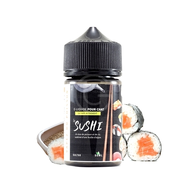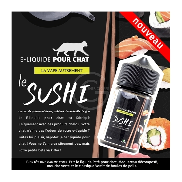 Un duo de poisson et de riz, sublimé d’une feuille d’algue et d'un arrière-goût de litière. Le E-liquide pour chat «Le sushi» de la gamme la vape autrement par GENERICLOP. Il est fabriqué uniquement avec des produits vraiement chelou. Votre chat n’aime pas l’odeur de votre e-liquide ?