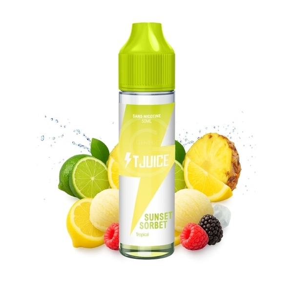 Découvrez Sunset Sorbet 50ml TJuice, une fusion rafraîchissante et ensoleillée qui réveillera vos sens. Ce e-liquide associe le peps du citron jaune et du citron vert à la douceur juteuse de l’ananas, le tout sublimé par une note de sorbet glacé pour une expérience à la fois fruitée, acidulée et givrée. PG/VG: 50/50 - Fabrication Française